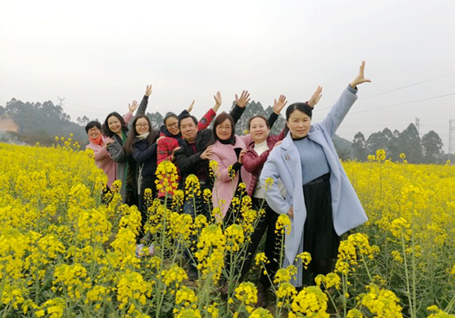 下午,在松柏楼三楼会议室进行退休教职工赵典强的欢送仪式,专业老师代表给赵典强献花。全体教职工在弘毅楼前拍照留影,然后集体乘坐大巴车出发。车上气氛轻松和谐,欢声笑声此起披伏。大概半小时的路程,来到川西坝子。老师们或在阳光下品茶闲聊,交谈甚欢,或在草坪上嬉戏摆拍,或沿绿道悠闲散步,有些老师来到田间欣赏金灿灿的油菜花,品味淡淡的花香,享受缕缕春风带来的盎然春意。不知不觉度过了一个愉快的下午,大家一起共进晚餐,乘车返回。