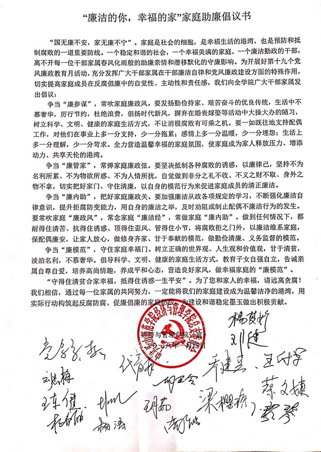 “国无廉不安,家无廉不宁”。家庭是社会的细胞,是幸福生活的港湾,也是预防和抵制腐败的一道重要防线。一个稳定和谐的社会,一个幸福美满的家庭,一个廉洁勤政的干部,离不开每一位干部家属春风化雨般的助廉亲情和潜移默化的守廉影响。为开展好第十九个党风廉政教育月活动,充分发挥广大干部家属在干部廉洁自律和党风廉政建设方面的特殊作用,切实提高家庭成员在反腐倡廉中的自觉性、主动性和责任感。