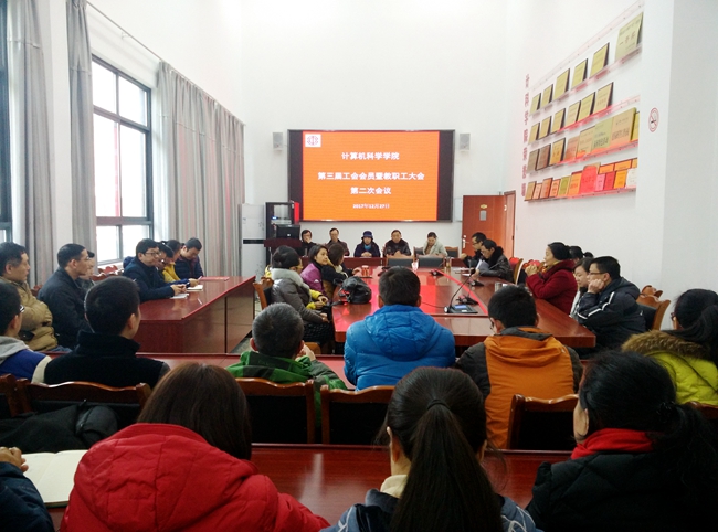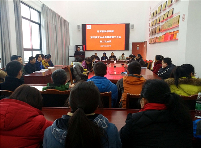 12月27日下午16:00,计算机科学学院第三届工会会员暨教职工大会第二次会议在特教大楼C幢501会议室隆重举行,校工会办公室主任李冉英代表校工会应邀出席大会并致词。会议由计科学院分工会主席罗谊恒主持。