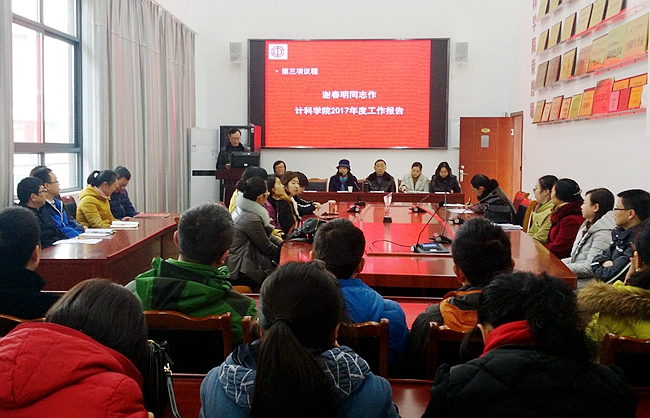 计科学院主持行政工作的副院长谢春明首先作计科学院2017年度工作报告,经全体教职工审议后获得通过。陈建国副院长就计科学院院训、院徽征集情况作了相关说明,对院徽logo元素进行了详细阐释,经全体教职工审议表决,顺利通过了计科学院院训、院徽设计方案。苏炳均副院长就《计算机科学学院精彩课堂教研活动方案》作了相关说明。