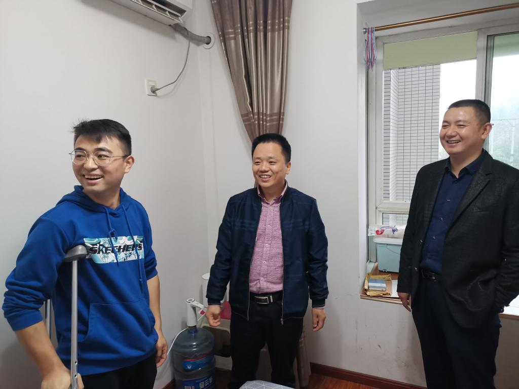 贾云强老师在汶川开展教研活动时意外受伤导致脚部骨裂。大家询问了贾云强租住房情况及受伤情况,困难及需求,并代表学院赠送了慰问品,勉励其安心将养身体。