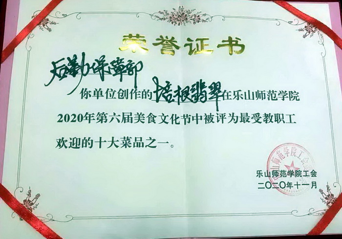 为了打造和谐、健康、文明的校园文化,展示教职工厨艺技能,提高教职工文化生活质量,由校工会组织开展的乐山师院第六届教职工美食文化节,于11月19日在陶然居学生食堂如期举行。后保部分工会参赛菜品再次荣获一等奖,饮食中心参赛的菜品中有五个菜品荣获“最受教职工欢迎的十大菜品之一”荣誉称号。