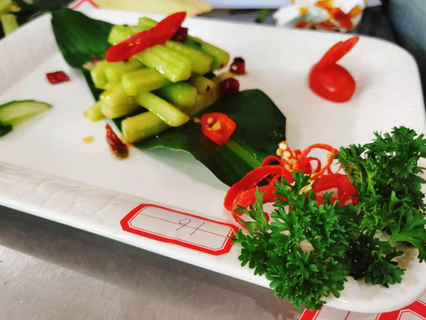 音乐学院的参赛菜品为家常回锅肉和油炝黄瓜条。比赛开始,各位老师分工明确,各司其职。只见曾皓老师手起刀落,一片片厚薄均匀形状方整的肉片出现在案板上,点火、热油、炒菜一气呵成,短短几分钟时间一道色香味兼俱的回锅肉出现在大家的眼里,勾引味蕾。吸引大家的不仅仅是色泽红亮的回锅肉,还有张玉莲老师精美的摆盘,翠绿的黄瓜条整齐的叠放和浇淋的辣椒汤汁形成了色彩的冲击,让评委老师眼前一亮。周琼怡老师的调味更是一绝,在保证了炝黄瓜香味的基础上还能有黄瓜本身的清甜。经过激烈的比赛角逐音乐学院凭借精美的摆盘,丰富的口感在比赛中获得了二等奖的荣誉。此次大赛增进了教职工之间的交流,倡导了健康美好的的生活态度,进一步丰富了教职工的文化生活。