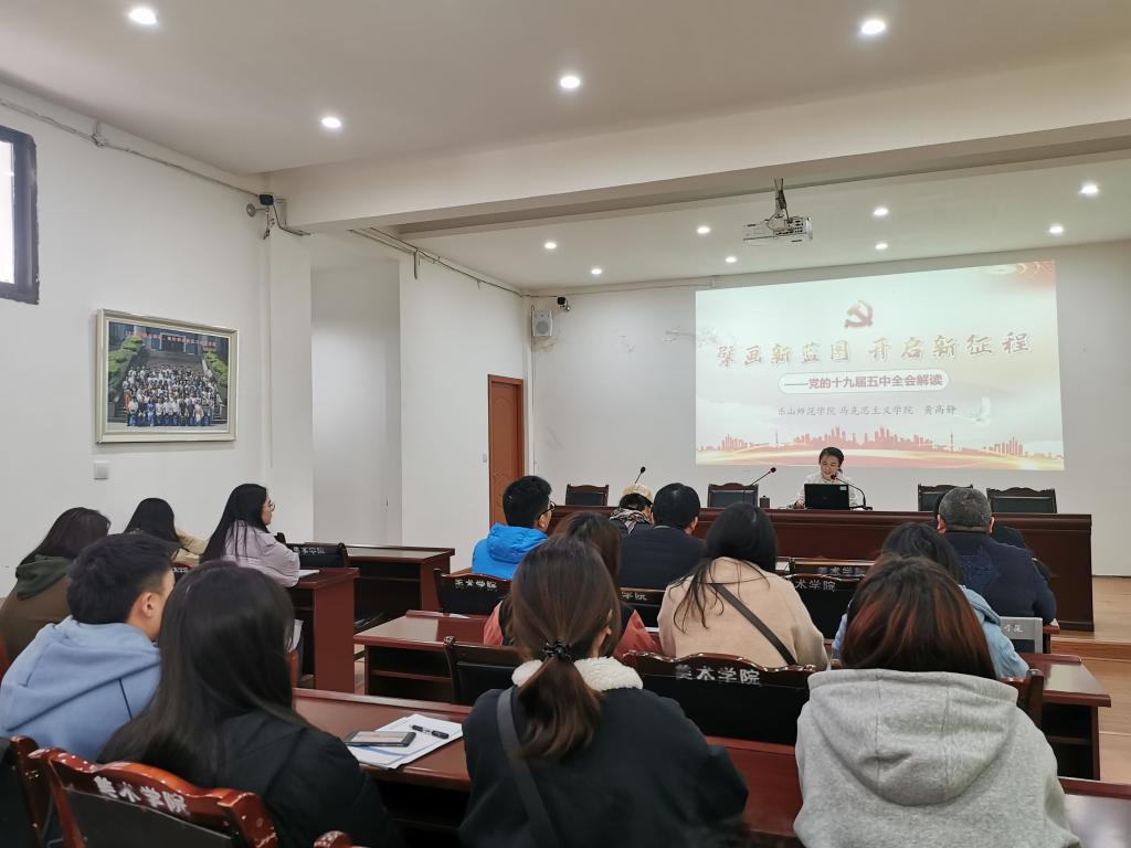 11月26日下午,美术学院分工会在松柏楼三楼会议室组织召开十九届五中全会精神学习宣讲会,邀请学校十九届五中全会精神宣讲团成员、马克思主义学院黄高静老师作宣讲报告。宣讲会由美术学院党总支书记熊泽文主持,美术学院教职工、学生党员和学生干部参加了本次学习。