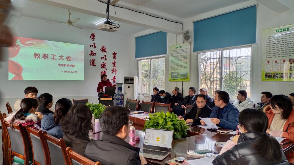 2020年12月24日下午,生命科学学院分工会在会议室召开教职工大会,会议由学院党总支书记唐梅主持,学院全体教职工参与了会议。