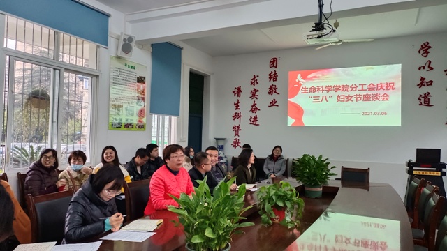 2021年3月6日,生科学院分工会 “三八”妇女节庆祝活动在学院会议室举行,庆祝活动采取座谈会形式进行,座谈会邀请到全院男教师参加,为女教师送上节日的祝福。会上,党总支书记唐梅通报了今年“先进女教职工”“文明家庭”推荐名单,并为每位女教师发放一份纪念品。