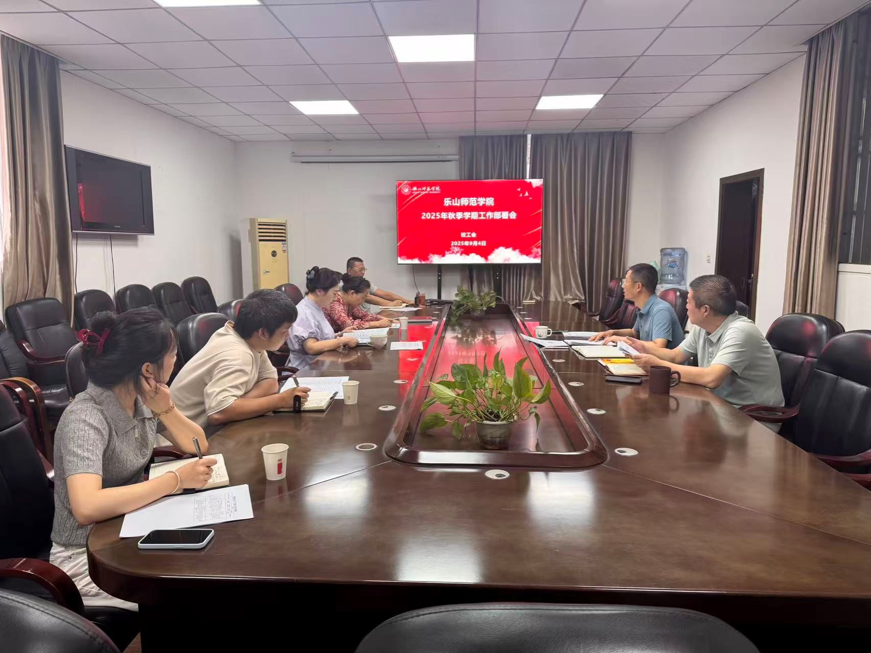 部署会上校工会党支部书记李同果通过春季学期先进工作者的评选、职工小家建设、暑期校职工慰问等工作内容进行总结;通过乐师院工(2025)1号文件,针对不同的工作内容,坚持贯彻学校党委四届七次全会精神,围绕学校2025年度工作要点和“数智赋能教育改革年”发展主题,对秋季学期乐山市第九届运动会参赛队伍建设、中秋节系国庆节慰问所需工作准备、第一次秋游活动的策划等各个时间节点的重要工作内容进行部署;最后,就校培训会议对工会党风建设工作安排。